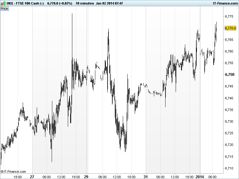 The UK 100 has maintained its upward course into the New Year and looks set to start 2014 with a test of the festive highs. As pointed to previously, this offers potential for the sideways 6720-6775 to have served as a pause and consolidation of the rally which began mid-December and allowing for a continuation of said trend and a test of 2013 highs. Recent data prints, however, show how important global growth sentiment remains.