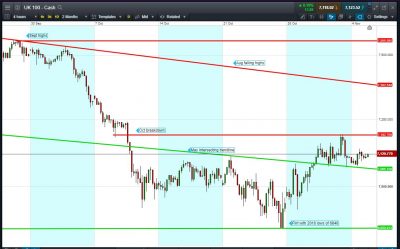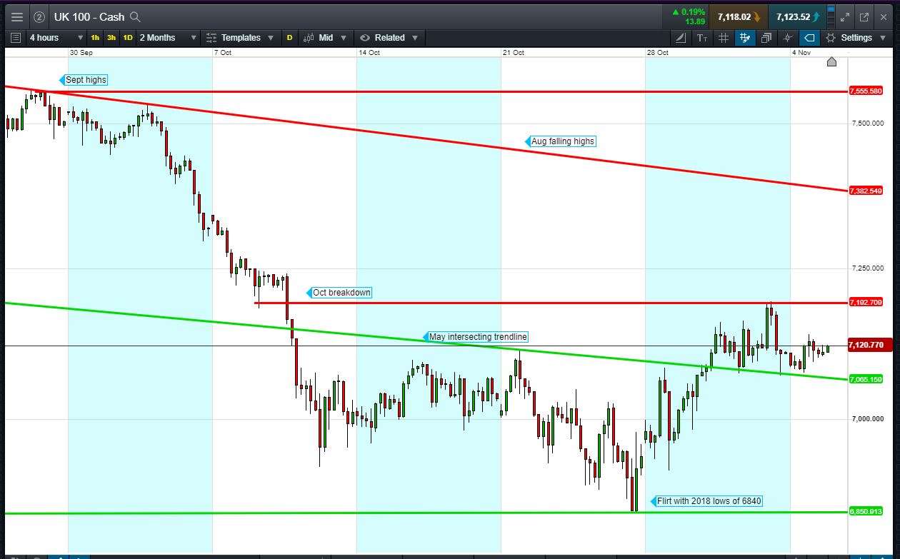 UK 100 Index called to open +15pts at 7120, in the middle of a 7075-7195 trading range since mid last week. The range represents continued consolidation of the recent rebound from a flirt with 2018 lows. Bulls need a break above yesterday’s 7141 highs. Bears require a breach of 7110 rising support. Watch levels: Bullish 7140, Bearish 7110