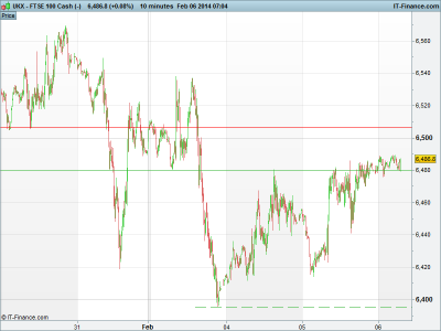 UK 100 futures pointing north for the first time this week with the bounce yesterday from 6400 low now testing highs of 6500. A break above this level could help another move towards 6600 as the first significant resistance on the upside. Comments from Fed’s Lockhart yesterday helped push the US to recover some losses – “Bond taper likely to continue, buying ended by 4Q”