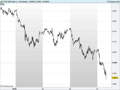 UK 100 Index called to open -145pts at 5925, having broken below 6000 overnight to maintain its New Year correction from 6300. All eyes on whether we get as low as December lows 5870 and if this can serve as support or whether we revisit 5800 and the intersecting trendline of support from end-July. Watch levels: Bullish 5970, Bearish 5915.