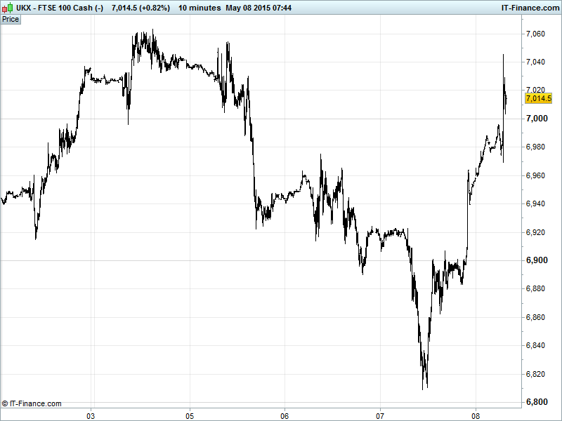 UK 100 Index called to open +130pts at 7015, making a significant recovery from the recent Fed Chair Yellen-fuelled sell-off to near 6800. This comes thanks to exit polls from the UK General Election suggesting the Conservatives could win an outright majority and maintain power. A move back to 7000 gives that all-time highs, achieved with Tories in power can be repeated. Watch for resistance at ceiling of recent falling channel at 7025. Watch levelsBullish 7065Bearish 6940.