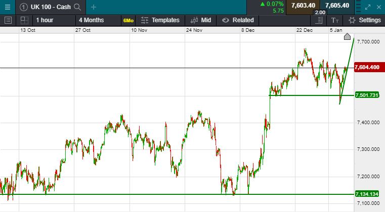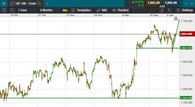 UK 100 called to open +30 points at 7604; Stocks in Asia extended a rally that began in America after the U.S. and Iran appeared to be stepping back from a deeper military conflict.  Global investors breathed a sigh of relief UK 100 futures drifted higher with S&P 500 contracts. Haven assets including Treasuries and gold rose, signalling some skittishness after several missiles struck the Green Zone in Baghdad.  The Dow Jones closed yesterday at 28,745 (+161 points), The S&P closed at 3,253 (+15 points) & the Nasdaq closed at 9,129 (+60 points).  In Asia the positive sentiment continued, with the Nikkei closing at 23,739 (+535 points) & the Hang seng completing a green sweep of major indices closed at 28,482 (+394 points).  Oil picked up overnight due to missile strike in Baghdad, trading at $66.27 at time of writing.  Similar concerns caused gold to pick up $6 from its floor overnight.  Trading at $1546 at time of writing.