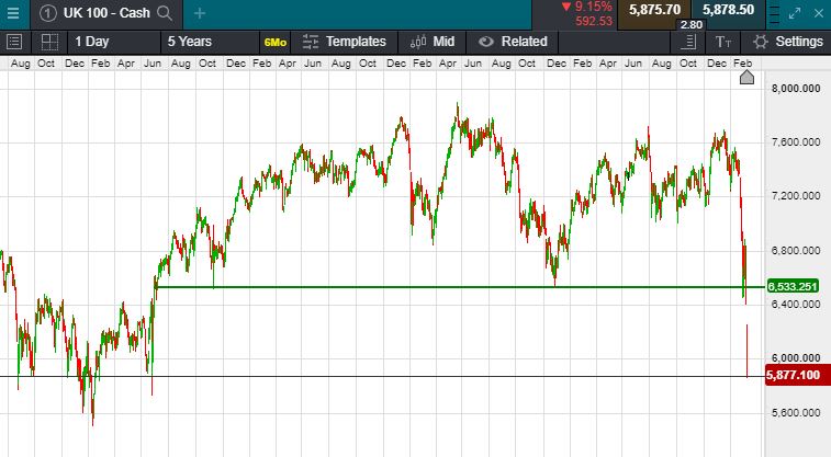 UK 100 called to open -568 points at 5890; The recent buoyancy in the world’s second-largest stock market in China was under threat Monday after oil plunged and U.S. index futures tumbled. A gauge of stocks in Shanghai and Shenzhen fell 2.6% in afternoon trading, while selling by foreigners was set to notch a record. An index of Chinese shares traded in Hong Kong dropped as much as 4.6%. The Nikkei closed 5% lower at 19,698 in Japan. Another shockwave is about to rip through a world economy already reeling from the coronavirus. Oil prices plunged after the dramatic breakdown of talks between OPEC and Russia on how to manage the world’s oil supply. Saudi Arabia responded with a price war and benchmark Brent crude tumbled by almost a third to $31 a barrel on Monday morning.