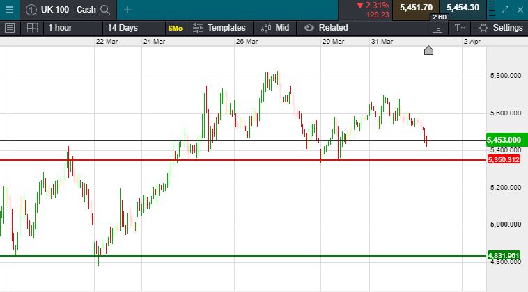 UK 100 called to open -220 points at 5454.  A negative trading session in Asia looks likely to continue into European markets this morning, this was after HSBC and Standard Chartered plunged in Hong Kong after deciding to scrap dividend and buybacks following urging from the U.K. regulator. Barclays also cancelled a payment of more than 1 billion pounds due to be distributed on Friday. The Nikkei traded 4.5% lower closing 851 points lower at 18,065.  In Hong Kong we saw the Heng Seng pull back 2.49%, closing 591 points down at 23,011.  Oil once again pulled back overnight, having seen signs of a relief rally yesterday, having traded at fresh 18 year lows on Monday, brent crude trades at $22 a barrel at time of writing.  Traditional safe haven gold has seen a small pick up overnight, trading almost 1% higher at $1588.