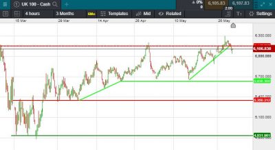 UK 100 called to open +75 points at 6150. The UK 100 looks set to make a positive start to the week, drawing comfort from the fact Washington stopped short of a full-blown escalation of the trade war with China over Hong Kong & investors welcomed this week's gradual reopening of businesses in England.  Shares in Asia rallied to three-month highs with the Hang Seng leading the way with a 3.4% gain after the US said it would simply revoke special trading privileges for the former British colony.
