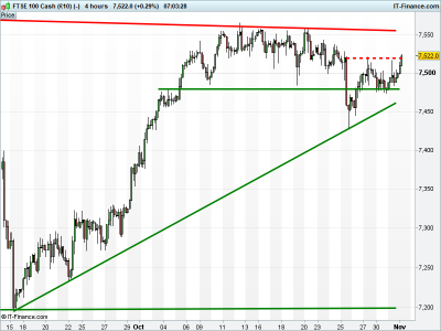 UK 100 Index called to open +30pts at 7525, after breaking above 7515 to clear falling highs resistance since Friday prior. Bulls like this as it extends the rebound from last Wednesday’s wobble and opens the door for a challenge on October’s 7555 highs, maybe even June’s 7600 record. Bears will be looking for any fresh downside test of 7500. Watch levels: Bullish 7530, Bearish 7510.