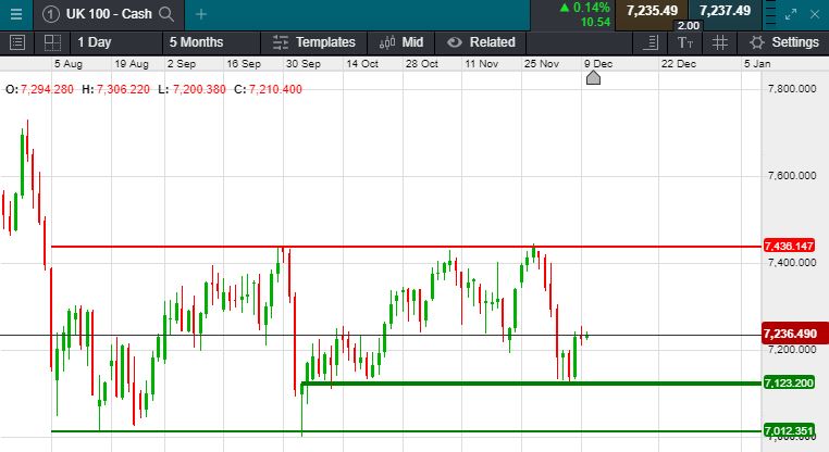 UK 100 called to open +7 at 7240 this morning; this follows overnight data that showed that China’s consumer inflation is at 8 year high, however PPI is stuck in the red. This paired with a lack of recent progress in U.S-SINO trade negotiations lead to a trading session in the red for major Asian bourses, the Nikkei fell 15 points to close at 23415, while the Hang Seng fell 11 points to close at 26483. Trading in the U.S also saw major indices trade lower, the Dow closed out the day at 27909 -105 points, will we see a break back through 28000 today? The S&P closed at 3136, -10 points & the Nasdaq closed at 8621, a fall of 35 points. Meanwhile oil overnight held firm over $64.5 per barrel as the Saudis agreed to cut production by 167,000 bpd, will further cuts see oil trading back to $70 a barrel? This was the level being touted on oil prices.com. Gold remained firm around the $1462 level overnight. With the general election just 48 hours away, will we continue to see investors position themselves today? Are we also gearing up for another Santa rally? These are just some questions dancing investors today.