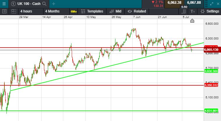 UK 100 called to open -50 points this morning at 6008. The sharp rise in new COVID-19 cases sparked concerns that new lockdowns could derail an economic recovery as a record-breaking surge of coronavirus cases hit several US states.. The UK 100 looks set to test the 6000 level having broken below rising support overnight as Asian markets were this morning in the red, with Japan’s Nikkei 225 off 145 points at 22,384 and Hong Kong’s Hang Seng index down 455 points at 25,755. With the US results season about to start in earnest next week, US indices had a rough day yesterday with the Dow Jones off 361 points at 25,706 and the S&P 500 18 points lower at 3,152. The NASDAQ once again bucked the trend rising 55 points to 10,548.