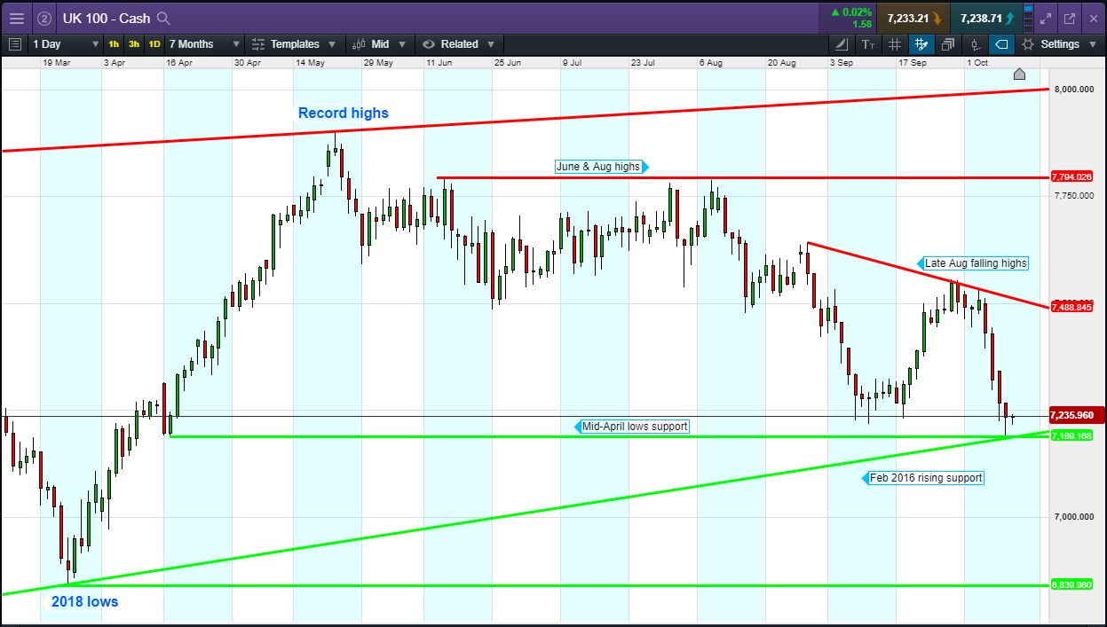 UK 100 Index called to open flat at 7235, holding yesterday’s bounce off 7189 (mid-April lows and 2016 rising support), giving hopes to the Bulls that a 4.8% correction from September highs will suffice for a market correction. Bulls need a break above yesterday’s 7250 highs. Bears require a breach of 7217 overnight lows. Watch levels: Bullish 7240, Bearish 7215