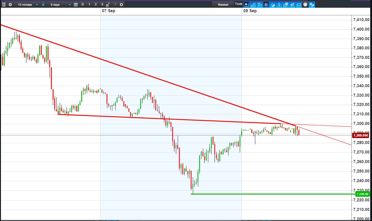 UK 100 Index called to open +10pts at 7288, well above Friday’s 7226 lows, but it has already found resistance at 7300 to maintain last week’s downtrend. Bulls need a break above 7300, to overcome the downtrend; Bears require a breach of 7280 to extend it. Watch levels: Bullish 7300, Bearish 7280.
