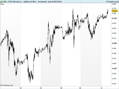 UK 100 called to open +35pts this morning at 6565 with Asian markets taking the baton from a positive finish in the US after geopolitical tensions eased thanks to Russia’s proposal of a Syrian surrender of weapons to avoid US intervention, something generated by comments from US Secretary of State John Kerry on a potential diplomatic solution leading Obama to make a quick change of tack and putting on hold anything military.