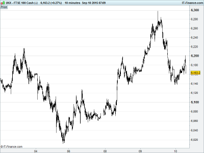 UK 100 Index called to open -65pts at 6160 having retreated from a breakout and test of 6300 yesterday to trade back below 6200 overnight. Support already found at 6140 which, coupled with rising lows at 6100, keeps the uptrend from late August and possibility of further gains alive. If 6200 proves resistant this morning, however, and we break below 6100 it could confirm a fake-out yesterday and the bears take back control. Watch levels: Bullish 6210, Bearish 6090.