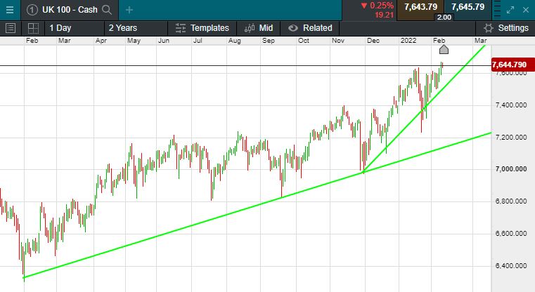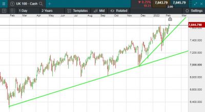 The UK 100 is called to open +5 points today at 7650. A marginally higher open is expected this morning for UK markets, continuing the strong performance we have seen this week. Asian markets were mixed on Thursday as the Reserve Bank of India’s governor announced that the repo rate will remain unchanged at 4%.  Japan’s Nikkei advanced 0.42% to 27,696 and South Korea’s Kospi rose 0.21% to 2775.  The Shanghai Composite in China fell 0.15% to 3,475 while Hong Kong’s Hang Seng slipped 0.19% to 24,782.  The picture was positive on Wall Street yesterday as tech shares led a broad rally, clawing back some of their losses after a rough start to the year.  The Nasdaq jumped 2.08% to close at 14,490.37. The S&P gained 1.5% to 4,587.18, while the Dow Jones rose 305.28 points, or 0.86%, to close at 35,768.06.