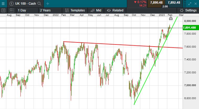 The UK 100 called to open -29 points at 7892.  The UK 100 looks set to narrowly fall on the open despite GDP data this morning showing the economy had just avoided a recession in the second half of the year.  In Asia this morning, the Nikkei index closed up 0.3%, while the Shanghai Composite index was down 0.3% and the Hang Seng in Hong Kong shed 2.0%.  In the US, the Dow closed Thursday down 249 points, at 33,670, the Nasdaq Composite lost 121 points to close at 11,790 and the S&P dropped 36 points to end at 4,082. The benchmarks all ended lower after starting the session in the green.