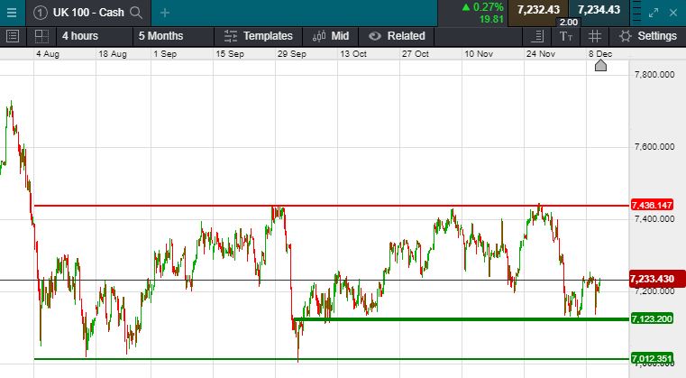 UK 100 called to open +25 at 7238 this morning; Yesterday evening a new survey indicated Boris Johnson's Conservatives may win the U.K. election by a smaller margin than previously predicted. This saw the pound fall, could this be good news for some of the UK Index heavyweights who report in USD? It was a mixed trading session in Asia, with the Nikkei subdued closing the day -8 points, whilst the Hang Seng had a far more positive session closing +207 points. In the U.S we saw a marginally negative trading session, but in the main close to flat, the Dow Jones closed at 27881 (-28 points), the S&P -4 points and the Nasdaq -5 points. Oil prices remained in focus overnight holding above $64.3 (support dating back to the start of the week). Whilst investor safe haven gold continued to tread water at $1464.