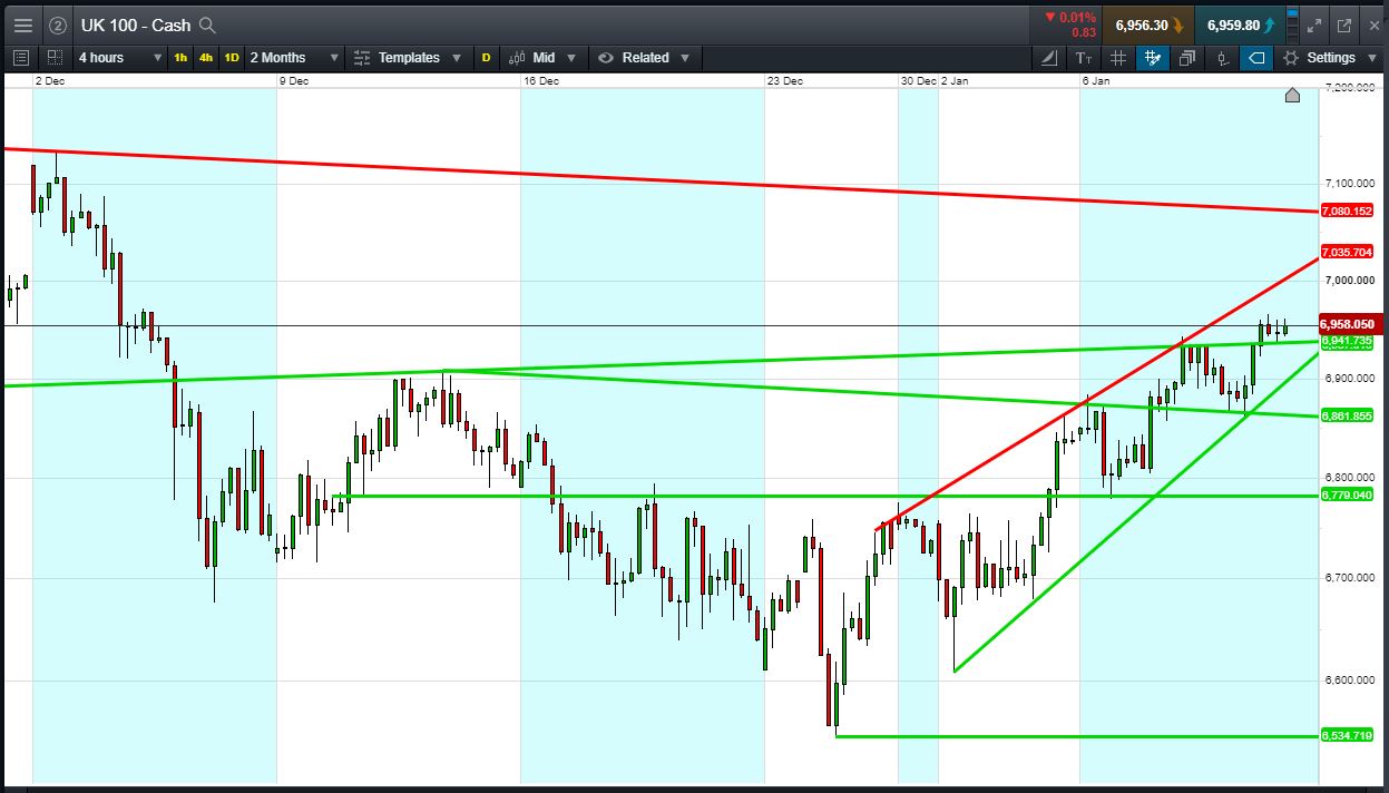UK 100 called to open +12pts at 6955, holding yesterday’s breakout above 6940. Bulls need a break above 6970 overnight highs to maintain the rising channel towards 3-month falling highs at 7078. Bears require a breach of rising support at 6945, if not the channel floor at 6915. Watch levels: Bullish 6965, Bearish 6945