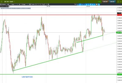UK Index ’s Energy shares aren’t helped by oil prices coming off July highs, in spite of a bullish API inventory report last night (same from EIA this afternoon?). That said, the trade-induced risk off mood isn’t seeing investors rush to the traditional safe-havens of JPY and gold, both trading lower as the USD trades firm. Along with trade fears, this is hurting metals like Copper and Miners traded lower down-under overnight (BHP -1.3%, Rio -1.8%.), which could be matched in London this morning.