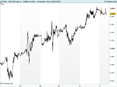 UK 100 called to open -5pts this morning at 6590, having tested but failed at the 6600 level several times yesterday and overnight. Geopolitics still the driver, with Syria situation cooling, alongside potential tapering by the Fed next week.