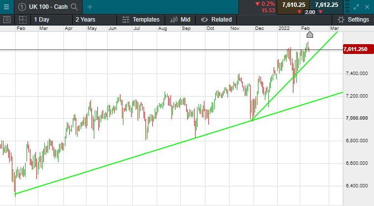 The UK 100 is called to open -60 points today at 7612. The UK 100 looks set for a pullback today after a week of pure positivity, this comes after US inflation rates hit 7.5% in January, accelerating at a rate faster than had been expected. US markets struggled yesterday, with the Dow Jones down 526 points (1.5%) at 35,242 and the S&P 500 off 83 points (1.8%) at 4,504. In Asia this morning, Tokyo has avoided the fall this morning, albeit through a market holiday while in Hong Kong, the Hang Seng index is down 151 points or 0.6% at 24,772.
