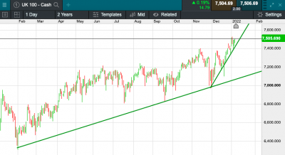 The UK 100 is called to open +40 points today at 7485. The UK 100 looks set to rebound this morning, after the latest data from the British Retail Consortium and KPMG shows total retail sales rose in the key month of December were up 2.1% compared with a year earlier, with a 4.6% rise on 2019. On Wall Street overnight, there were further declines for the Dow Jones and S&P 500 indices, of 0.45% and 0.14% respectively, while the tech-filled Nasdaq fell to a 10-week low before bargain hunters dived in and the index registered a 0.05% rise by the closing bell.