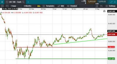 UK 100 called to open +21 points at 5990. Asian markets followed the US lead from Friday and finished in positive territory, as investors looked to more countries restarting their economies. More and more countries are loosening restrictions as people try to get back to a somewhat normal version of life. This comes even as South Korea warns on a second wave of the coronoavirus as infections hit a one-month high, whilst new infections accelerated in Germany. Are the positive moves we are seeing a case of bad news is good news? Gold edged higher to $1706, as Brent oil sold off 1% lower to $30.75.