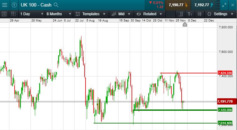 UK 100 called to open +12 at 7200 this morning, providing investors with some much needed positive sentiment to begin the trading day, US trading closed on a positive note with the Dow Jones +147 points, the S&P +20 points and the Nasdaq +47 points. overnight in Asia we saw the Nikkei +164 points and the Hang Seng +133 points perhaps suggestions that negative sentiment has turned positive ahead of today’s OPEC meeting at which Saudi Arabia will use both stick and carrot to persuade its OPEC partners to defend oil prices. Oil continued to find rising support overnight settling at $63.4 per barrel to stay in its one month long up-channel. Gold continued to tick upwards as the traditional safe haven continued its recent momentum to settle at $1477.