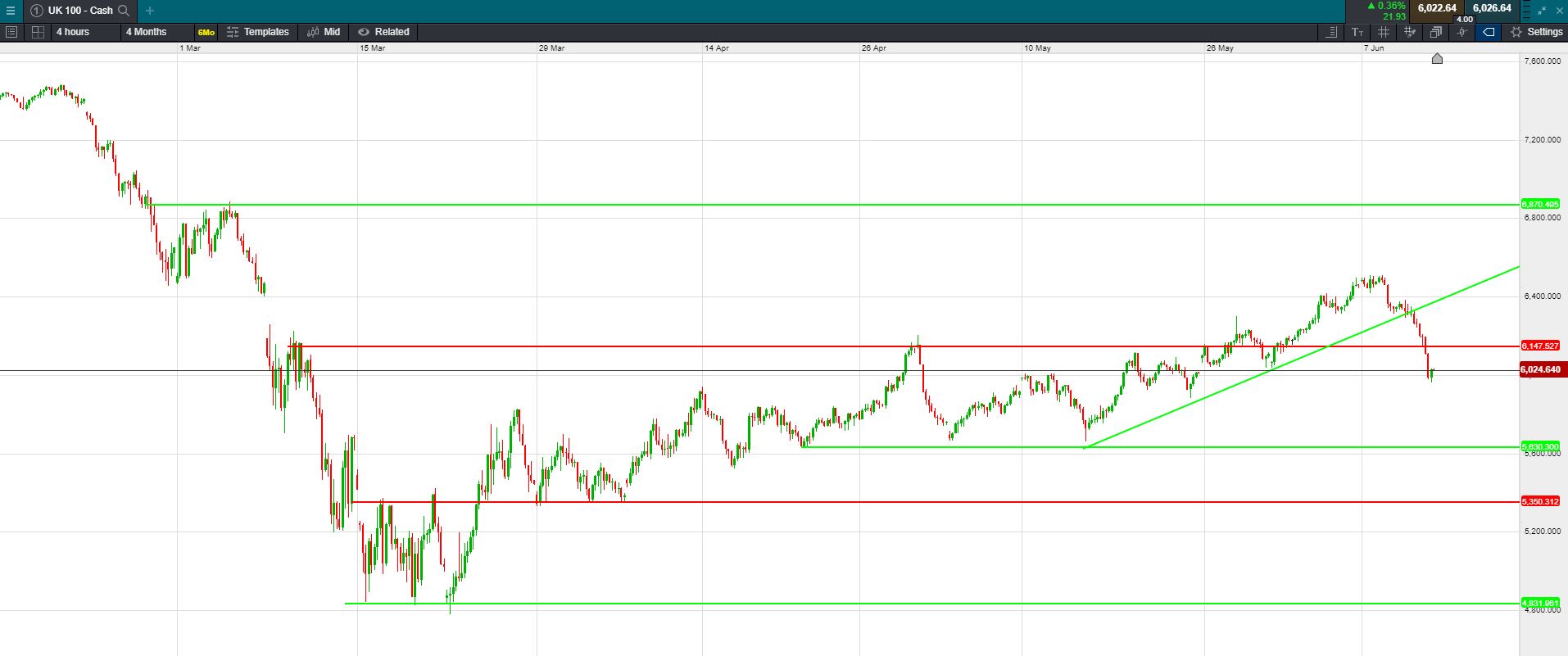 UK 100 called to open -90 points this morning at 6003. The global sell off continued last night, halting the recovery rally firmly that we had seen for the last few weeks. After the FED's dour outlook triggered the fall, oil prices extended losses last night due to worries on weak global demand, and on new concerns of a resurgence of coronavirus infections. Investors fear this could stunt the speed of recovery in economies around the world which have only just started opening slowly after lockdown, leading many to believe the anti-virus restrictions were lifted too early. The threat of fresh restrictions could also be on the horizon. WTI Oil slipped 1.49% to $35.80, whilst Brent fell 1.19% to %38.09.