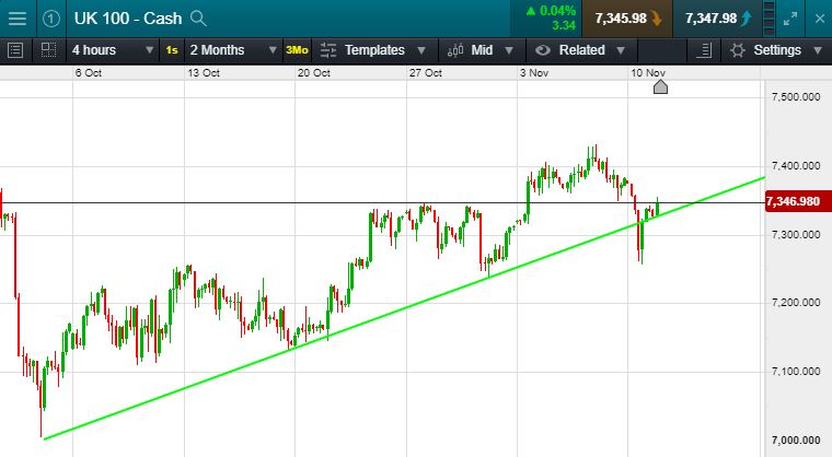 UK 100 Called to open +30 points at 7358; With muted anticipation rising ahead of Trumps trade negotiation speech later today, we are set for a positive start to the trading session. In focus today will be investor reaction to yesterdays stand out UK news that Nigel Farage will step aside and not fight conservative seats at the general election, This increases the chances of a conservative majority and decreases the chances of a hung parliament. This saw Brexit sensitive stocks rally yesterday (Lloyds bank +3%; RBS +4.5%; Barratt Developments +4% to name but three) will this continue today? Or could we see profit taking step in? Overnight we saw a muted trading session in the US for veterans day. The Dow +10 points; The S&P -6 points; The Nasdaq -11 points. In Asia we saw far more positive sentiment with the Nikkei +188 points & the Hang Seng +106 points. China bank loans hit 22 month lows with more easing expected contributing to this rise. Oil sits at $62.5 per barrel. Whilst Gold continued to fall as risk on appetite increased, now sitting just above $1450.
