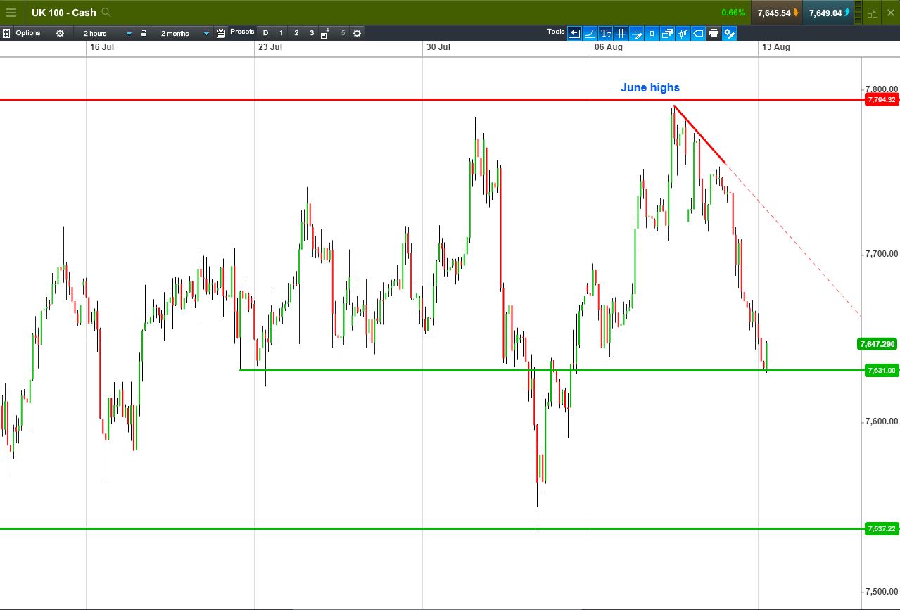 UK 100 Index called to open -20pts at 7648, after having bounced from last week’s 7635 lows. Bulls need a break above 7666 overnight highs to once again try regain August highs. Bears require a breach 7630 overnight lows. Watch levels: Bullish 7670, Bearish 7617