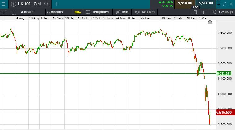 UK 100 called to open +276 points at 5514. Asian stocks pared losses following the worst Wall Street session since 1987, as U.S. futures pushed higher. Still, most benchmarks remained in the red, with investors spooked that emergency fiscal and monetary packages won’t be enough to stave off a recession. S&P 500 contracts reversed losses of as much as 3% and climbed. Oil headed for its biggest weekly drop since 2008 as an unprecedented dual supply-demand shock showed no signs of abating. Futures reversed a loss to rise on Friday, tracking a rebound in U.S. equity futures, while a retaliatory American attack on an Iraqi militia may have lent some support. They’re still down 22% this week as the coronavirus batters demand. Not even the safe haven of gold has been spared from this week’s global market rout. Bullion is heading for its biggest weekly loss since 2013, despite climbing to the highest in more than seven years earlier this week, as investors sell the metal to meet liquidity needs.