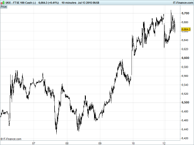 The negative opening call comes from marathon overnight talks between Greece and Creditors failing to find compromise on a third bailout (€86bn). The €30bn increase on last week’s figure is due to frozen banks needing urgent recapitalisation if they are to reopen. China’s equity market bounce is offering some solace, buoying equities in Asia helped by better than expected China trade data as exports rebounded and imports contraction slowed.