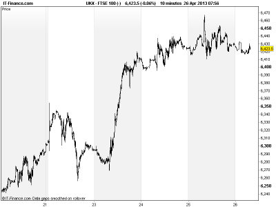 UK 100 perhaps taking a breather after the 3.5% from recent lows, with little fanfare from the UK’s GDP beat, while no big change by BoJ, some negative comments from Bernanke and slower growth from internet giant Amazon may have taken wind out of market’s sails until this afternoon’s US GDP update and a long Asian weekend. Support possible 6415, resistance 6500.