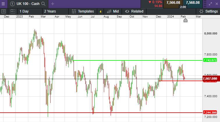 The UK 100 called to open -3 points at 7,570.  The UK 100 looks set to open marginally lower this morning, December’s unemployment data was released earlier, and it showed lower than expected unemployment at 3.8% compared to 4% predicted.  UK weekly wages saw a modest year-on-year increase of 5.8% to £669, marking the slowest growth in 17 months yet edging past predictions by a narrow margin.  The rise, albeit minimal, surpassed the anticipated 5.6% hike.  Stateside, The Dow Jones rose to a new high on Monday as investors awaited fresh inflation and earnings data.  The 30-stock index advanced 125.69 points, or 0.33%, to settle at 38,797.38. The S&P 500 inched lower by 0.09% to end at 5,021.84, while the Nasdaq slid 0.3% to close at 15,942.55.