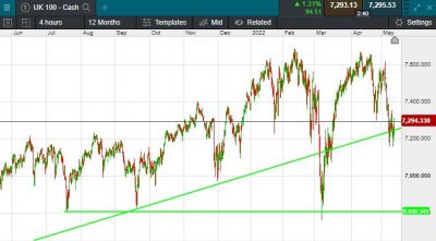 The UK 100 is called to open +67 points this morning at 7300. The UK 100 looks set for a rebound this morning following a difficult session yesterday, thanks in main to calming comments from Fed chair Jerome Powell, who stuck to the 0.50% rate hike script overnight, temporarily dispelling 0.75% nerves. In the US, the Dow Jones slipped 103 points to 31,730 while the S&P 500 dipped 5 points to 3,930, having reversed early losses, as a semblance of calm descended on Wall Street into the close. Asian markets are mostly higher this morning with Japan’s Nikkei 225 669 points heavier at 26,418 and Hong Kong’s Hang Seng index 387 points to the good at 19,767.