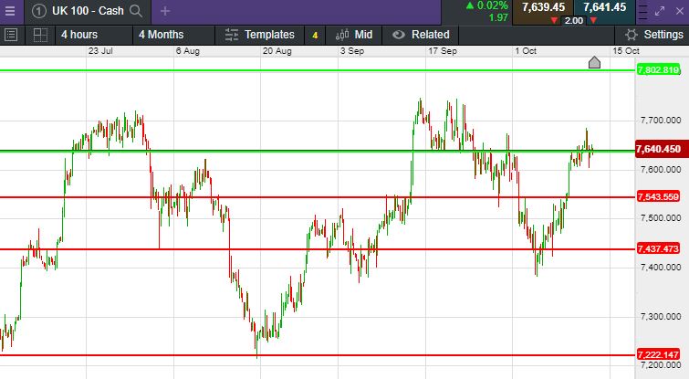 The UK 100 called to open -3 points at 7,641. The UK 100 is expected to open marginally lower on Friday after slightly stronger than expected US inflation data put the possibility of a US rate hike back on the table, and after weak trade data from China. Yesterday on Wall Street saw the Dow Jones fall 0.5%, while the S&P and the Nasdaq Composite both gave up 0.6% after the US yearly inflation rate was unmoved at 3.7%. In China, inflation was flat, while the producer price index fell 2.5%, according to official data released this morning, trade figures showed exports fell 6.2% annually in September, better than the 8.3% fall expected while imports declined 6.2% from the year before, slightly worse than estimates of 6.0%.