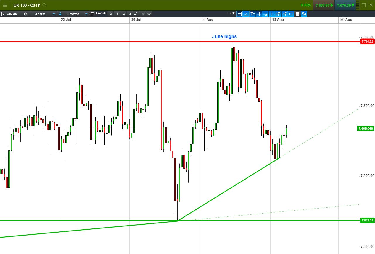 UK 100 Index called to open +25pts at 7668, rebounding from a 2-week rising support and 7625 overnight lows. Bulls need a break above 7691 to resume the uptrend toward June highs. Bears require a breach 7625 rising support. Watch levels: Bullish 7700, Bearish 7614