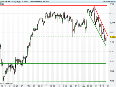 UK 100 Index called to open +10pts at 7425, challenging yesterday’s breakdown of key October support. Bulls need a break above falling highs resistance at 7450 to reverse the current downtrend. Bears require a breach of 7400 to extend the decline from 7 Nov highs. Watch levels: Bullish 7450, Bearish 7400.