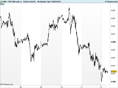 UK 100 called to open -35ts at 6525 this morning after US equities extended losses on Friday (S&P500’s worst week since Jan), the technology sector continuing to suffer (Nasdaq’s worst week since 2012) from fears of overhype and lofty valuations after the recent market advances (something also hurting many recent UK IPOs) as well as a disappointing Q1 earnings report from US banking giant JPMorgan weighing on financials even if peer Wells Fargo beat consensus earnings. Remember Citigroup reports Q1 today, Bank of America on Weds and Goldman Sachs on Thurs.