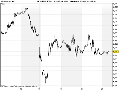 UK 100 trading at lower end of narrow 6430-3480 range. As we always say, tight ranges often lead to explosive reactions, very possible when we have more concrete decisions on Cyprus. As for last few days, 100pt swing either way still possible.