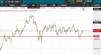 UK 100 called to open -50 points this morning at 6126. This comes on the back of a negative start at the start of the week in the US, Wall Street’s tech stocks backtracked dramatically from early gains, with traders showing concerns over news that California was bringing back lockdown measures due to the rampaging coronavirus. The Nasdaq initially rose 2% to notch up another new all-time high before turning tail and ending the session down 2.1% at 10,390, while the Dow Jones and S&P 500 similarly started well before taking a tumble to end flat and down 0.9% respectively. In focus today will be the start of earnings season, which begins today, expectations are low, with profits predicted to take a 40-50% hit as the pandemic forced businesses to close their doors around the world. Crude Oil trades lower 1.6% at $42.05. While gold is also down 0.3% to trade at $1,797.67 per ounce.