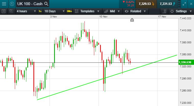UK 100 called to open -20 at 7330; On the back of Chinese data in October missing consensus and marked the slowest pace since at least 1998. Japan's GDP expanded 0.2%, shy of the 0.9% forecast, and Australia's jobless rate unexpectedly rose. Trading in the US showed signs of investor confidence growing once more, the Dow Jones closed +92 points, whilst the S&P and Nasdaq closed flat, recovering from a fall earlier in the trading session. In picture was more bleak in Asia, on the back of above mentioned data, the Nikkei closed -178 points & the Hang Seng followed yesterdays 2% fall, losing a further 1% (-285 points). Oil prices rose slightly overnight to sit just below $63. Gold rose slightly but still sits $90 off recent highs at $1466.