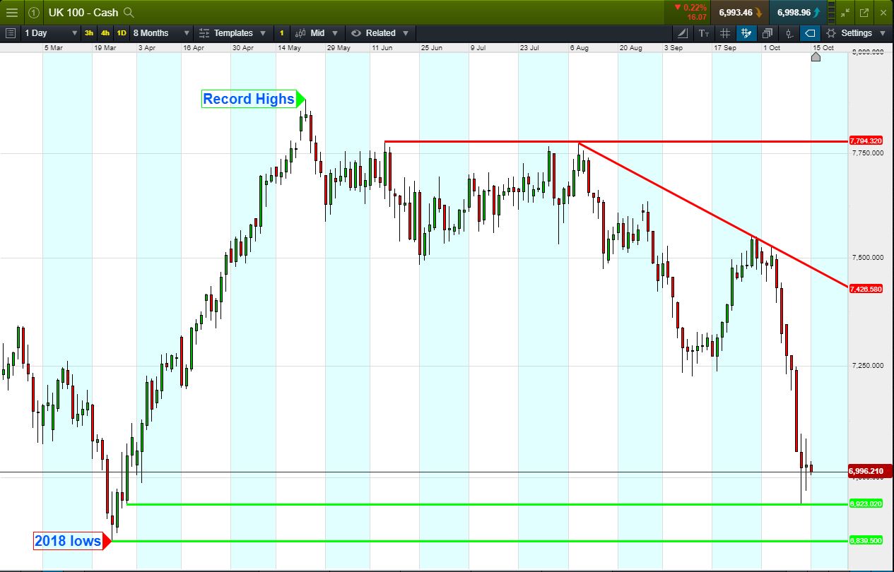 Calls for a muted open come after a negative start to the week in Asia, where concerns over rising US interest rates continued weighing on equities. Brexit negotiations suffered another setback over the weekend, as PM Theresa May rejected key EU proposals over the Irish border, dealing a blow to negotiations to avert a hard Brexit. This has sent the GBP sharply lower ahead of an EU leaders summit on Wednesday, helping UK Index ’s international names.