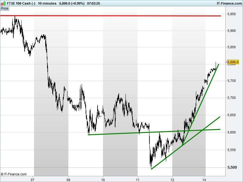 UK 100 Index called to open +100pts at 5805, keeping with Friday’s accelerated uptrend, putting on another 100pts overnight to break beyond February’s downtrend at 5700. Nonetheless, a longer-term chart shows us still within a 4-month falling channel with upside potentially capped at 6000. Watch levels: Bullish 5820, Bearish 5770.