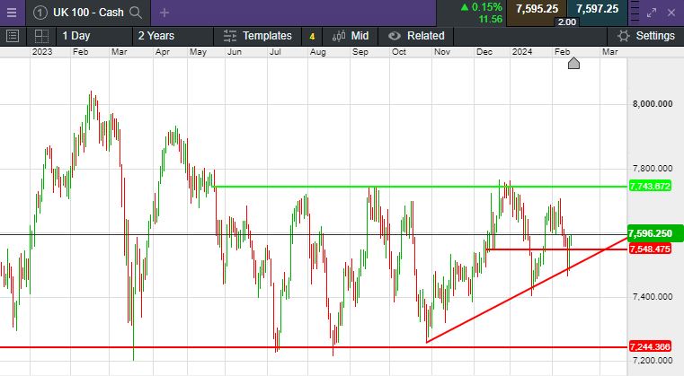 The UK 100 called to open +28 points at 7,596. The UK 100 looks set for a bright start this morning, this comes after data out today, showed the UK has officially entered a technical recession, after GDP declined in the fourth quarter. Official statistics show a 0.3% decline, worse than economists had expected. This has seen The pound fall to $1.2557, it had been trading at about $1.270 before the announcement. Sterling has been close to steady since November. Stocks rose Wednesday on Wall Street, as markets clawed back some of the steep losses suffered in the previous session. The S&P advanced 0.96% to finish at 5,000.62, while the Nasdaq climbed 1.3% to settle at 15,859.15. The Dow Jones added 151.52 points, or 0.4%, closing at 38,424.27.