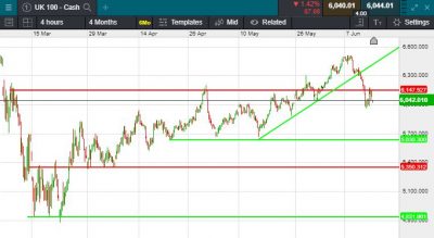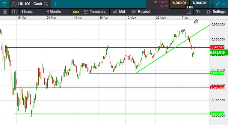 UK 100 called to open -130 points this morning at 5960.   Traders wake up to another sea of red this morning, as major indices are mostly called to open negative. Oil prices slipped last night, as fears of a second wave of coronavirus infections coupled with underwhelming Chinese industrial output figures, did little to enthuse the market. Safe havens were sought after on the back of this, gold rising 0.2% to $1732 an ounce. Beijing has recorded dozens of new COVID-19 cases over the weekend, which were linked to a major market. Localised closures have ensued. The US itself, recorded 25,000 new cases on Saturday alone. Will bad data be good again, as we await US May retail sales on Tuesday, expected to show a bounce. Oil extended losses with Brent down 2.25% at $37.86 and WTI down 3.09% at $35.14.