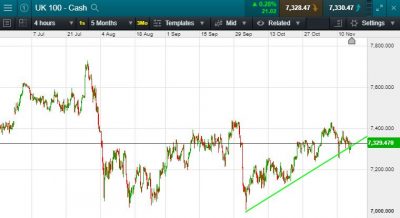 UK 100 called to open +44 points at 7334; On the back of overnight news that U.S.-China trade talks are down to the "short strokes" and officials are talking daily, White House economic adviser Larry Kudlow said. Trading in the US saw early losses pared by the close, with the Dow closing flat, the S&P +2 points and the Nasdaq -3 points. It was a different story in Asia on the back of trade talk positive sentiment the Nikkei +points, and the Hang Seng +41 points. Oil rose slightly from yesterdays closing price to settle at $62.6 per barrel and gold pulled back slightly from session highs of $1471 to sit at $1464 at time of writing.