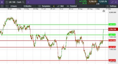 The UK 100 called to open +54 points at 7,727.  The UK 100 is expected to open higher after strong gains in the US on Thursday after economic data suggested the FED may pause on rates and better-than-expected economic data in China.  China’s retail sales and industrial production grew faster than expected in August, data showed on Friday, in a boost after policymakers stepped up stimulus measures to support the world’s second-biggest economy.  On Wall Street yesterday all three major indices ended in the green, with the Dow Jones added 1.0%, while the S&P 500 and the Nasdaq Composite both rose 0.8%.