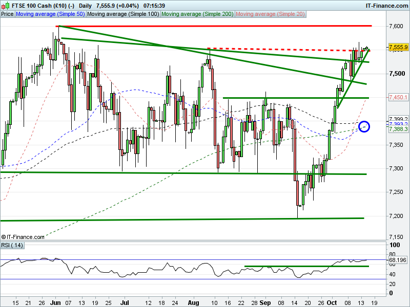 Calls for a positive open come after Wall St closed higher on Friday as mixed Bank earnings and slower US inflation data fueled hopes of a slower Fed hiking cycle. Asian bourses have made a solid start to the week thanks to supportive Chinese inflation which has helped metals prices higher (helpful for UK Index Miners) while oil has rallied on fears of supply disruption amid conflict between Kurdistan and Baghdad after last month’s referendum.