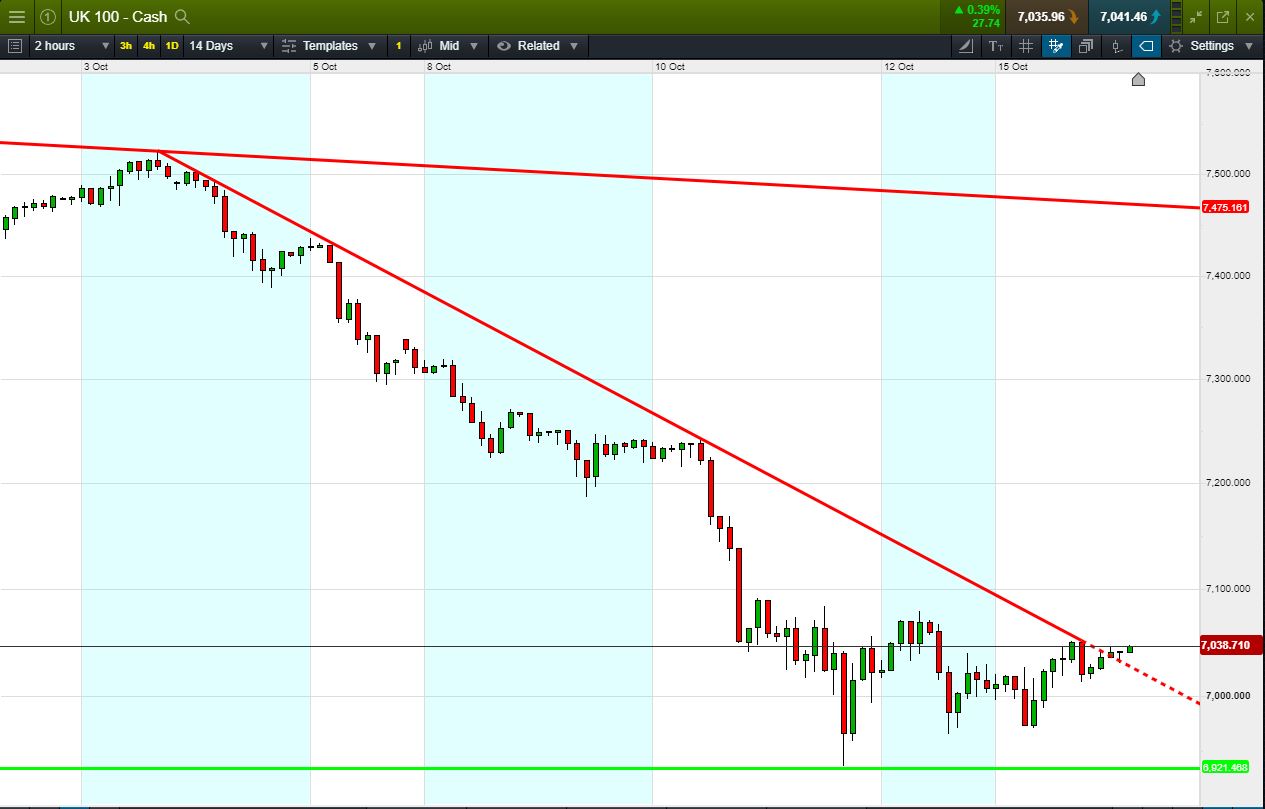 UK 100 Index called to open +4pts at 7033, extending the rebound from October lows and testing a breakout from 2-week falling highs resistance. Bulls require a breach of 7043 overnight highs to cement the breakout. Bulls requires a breakdown back below the 7016 falling highs resistance. Watch levels: Bullish 7060, Bearish 7000