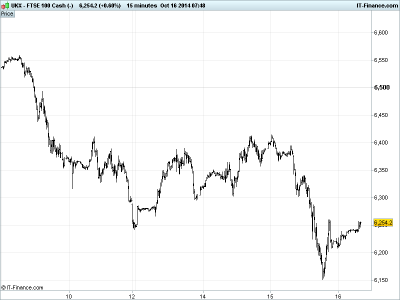 UK 100 Index called to open +35pts at 6250, rebounding after the recent sell-off had another go south yesterday to plumb lows of 6150 on mounting concerns about global growth exacerbated by a poor batch of US data and stagnant German inflation coupled with steep drops in the price of oil which saw flight to the traditional safehavens of Gold, the JPY and US treasuries.